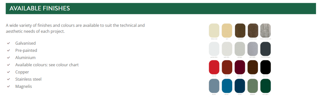 We use only quality raw materials; the flashings can be manufactured up to 8 metres in length, with thicknesses from 0.50 mm to 3.00 mm and with a variety of different metal finishes:
