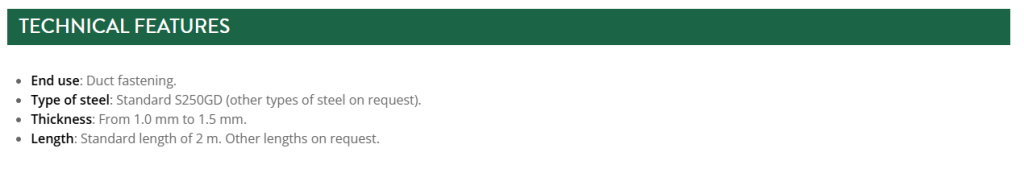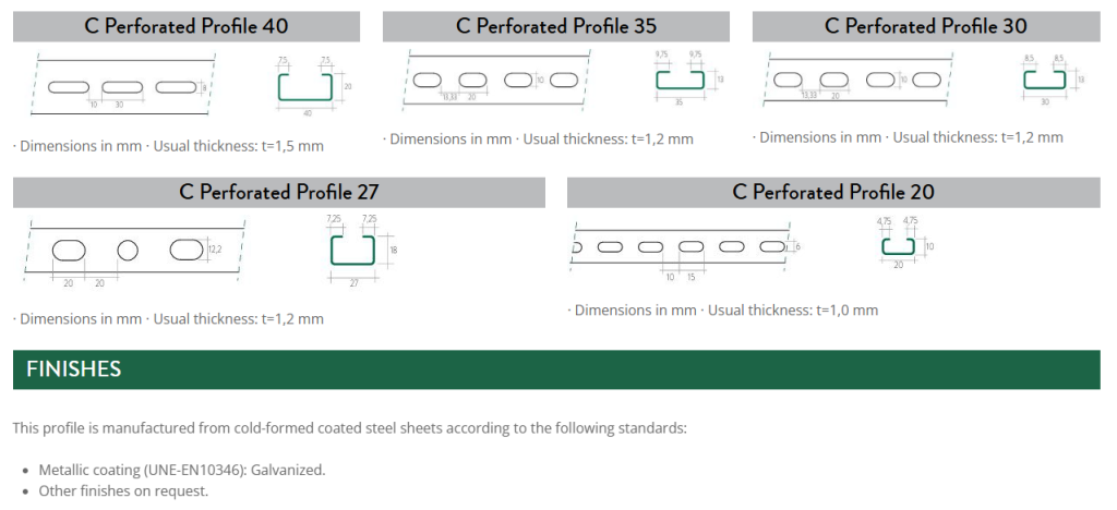 Type “C” Perforated profile with different sizes and thicknesses. Made of galvanized or electrozinced steel. They are specially designed for fastening ducts: air conditioning, ventilation, electrical installations, plumbing, heating and photovoltaic plate supports in self-consumption systems.